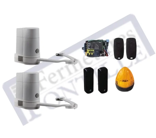 Kit complet de motorisation 24V pour portails battants avec bras articulés. Inclut moteurs, commande, télécommandes, cellules et feu LED. Pour vantaux jusqu’à 2 m / 250 kg.